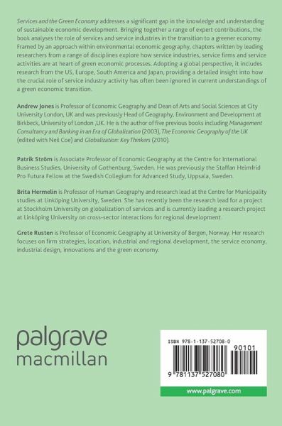 Acknowledgments-. Notes on Contributors-. List of Tables and Figures-. Introduction: Services and the Green Economy (Andrew Jones, Patrik Strom, Brita Hermelin and Grete Rusten)-. Part One: Services and the 'Greening' of Economic Development-. Green Services Development- Aspects of Local Policy and Cross-sector Interactions (Brita Hermelin)-. The Structure, Strategy and Geography of Green Certification Services (Grete Rusten)-. Remanufacturing as an Enabler for Green Service Models (Mitsutaka Matsumoto)-. The Transformative Roles of Knowledge-Intensive Business Services in Developing Green ICT. Evidence from Gothenburg, Sweden (Xiangxuan Xu and Patrik Strom)-. Market Conditions for Sustainable Entrepreneurship: A case study of green support services (Helge Lea Tvedt)-. Part Two: Services and the Transition to Green Economy.- Greening Finance and Financing the Green: Considerations and observations on the role of finance in energy transitions (Hans-Martin Zademach and Johanna Dichtl)-.Carbon offsetting and corporate strategies: The case of large German firms (Britta Klagge and Sebastian Reimer)-. Who is driving the 'smart city' agenda? Assessing Smartness as a Governance Strategy for Cities in Europe (Havard Haarstad)-. Part Three: Contrasting Industry Cases: Engineering, Viticulture and Construction-. Service Engineering Research in Japan: Toward sustainable society (Kentaro Watanbe, Masaaki Mochimaru and Yoshiki Shimomura)-. The Greening of Chilean Wineries through Specialized Services (Nanno Mulder)-. Keeping up with the Pace of Green Building: Service provision in a highly dynamic sector (Christian Schulz and Berenice Preller)-. Conclusion: The Central Role of Services in the Greening of the Economy (Andrew Jones, Patrik Strmo, Brita Hermelin and Grete Rusten).-