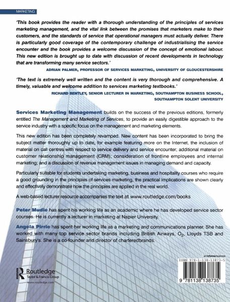 "This book provides the reader with a thorough understanding of the principles of services marketing management, and the vital link between the promises that marketers make to their customers, and the standards of service that operational managers must actually deliver. There is particularly good coverage of the contemporary challenge of industrialising the service encounter and the book provides a welcome discussion of the concept of emotional labour. This new edition is brought up to date with discussion of recent developments in technology that are transforming many service sectors". Adrian Palmer, Professor of Services Marketing, University of Gloucestershire "The text is extremely well written and the content is very thorough and comprehensive. A timely, valuable and welcome addition to services marketing textbooks." Richard Bentley Senior Lecturer in Marketing, Southampton Business School, Southampton Solent University