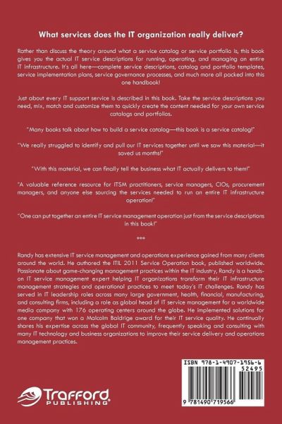 What services does the IT organization really deliver? Rather than discuss the theory around what a service catalog or service portfolio is, this book gives you the actual IT service descriptions for running, operating, and managing an entire IT infrastructure. It's all here-complete service descriptions, catalog and portfolio templates, service implementation plans, service governance processes, and much more all packed into this one handbook! Just about every IT support service is described in this book. Take the service descriptions you need, mix, match and customize them to quickly create the content needed for your own service catalogs and portfolios. "Many books talk about how to build a service catalog-this book is a service catalog!" "We really struggled to identify and pull our IT services together until we saw this material-it saved us months!" "With this material, we can finally tell the business what IT actually delivers to them!" "A valuable reference resource for ITSM practitioners, service managers, CIOs, procurement managers, and anyone else sourcing the services needed to run an entire IT infrastructure operation!" "One can put together an entire IT service management operation just from the service descriptions in this book!"
