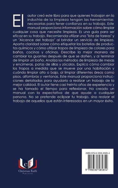 El autor creó este libro para que quienes trabajan en la industria de la limpieza tengan las herramientas necesarias para tener confianza en su trabajo. Este manual proporciona información sobre cómo limpiar cualquier cosa que necesite limpieza. Es una guía para ser eficaz en su trabajo. Recomienda utilizar una "lista de tareas" y un "Alcance del trabajo" al brindar un servicio de limpieza. Aporta claridad sobre cómo etiquetar las botellas de productos químicos y cómo utilizar trapos de limpieza de colores para baños, cocinas y oficinas. Describe la mejor manera de cambiar los guantes después de que se dañen, y al terminar de limpiar un baño. Analiza los métodos de limpieza de mesas y encimeras, patas de sillas y zócalos. Explica cómo cambiar los trapos a medida que se mueve por una habitación y cuándo limpiar alto o bajo, al limpiar diferentes áreas como pisos, alfombras y ventanas. Este manual proporciona instrucciones detalladas para ayudarlo a realizar un trabajo de la mejor calidad. El autor tiene casi treinta años de experiencia y se ha tomado el tiempo para reflexionar. Ha creado un manual con la expectativa de que ayude a cualquier persona. No se pretende eclipsar tu trabajo, sino realzar el trabajo de aquellos que están interesados en un mayor éxito.