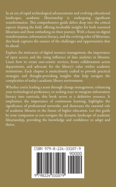 In an era of rapid technological advancements and evolving educational landscapes, academic librarianship is undergoing significant transformation. This comprehensive guide delves deep into the critical aspects shaping the field, offering invaluable insights for both seasoned librarians and those embarking on their journey. With a focus on digital transformation, information literacy, and the evolving roles of librarians, this book captures the essence of the challenges and opportunities that lie ahead. Explore the intricacies of digital resource management, the importance of open access, and the rising influence of data analytics in libraries. Learn how to create user-centric services, foster collaboration across departments, and advocate for the library's value within academic institutions. Each chapter is meticulously crafted to provide practical strategies and thought-provoking insights that help navigate the complexities of today's academic library environment. Whether you're leading a team through change management, enhancing your technological proficiency, or seeking ways to integrate information literacy into curricula, this book serves as a definitive resource. It emphasizes the importance of continuous learning, highlights the significance of professional networks, and showcases the essential role of academic libraries in the future of higher education. Let this guide be your companion as you navigate the dynamic landscape of academic librarianship, providing the knowledge and confidence to adapt and thrive.