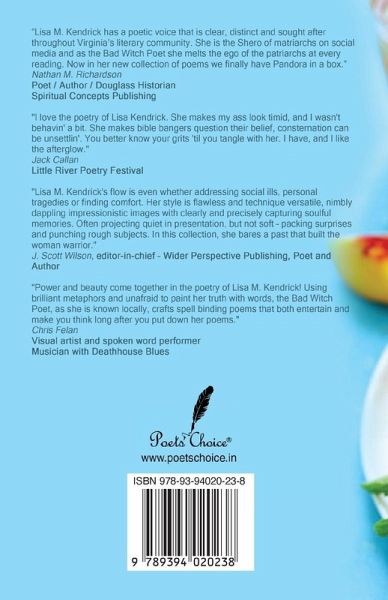 "Lisa M Kendrick has a poetic voice that is clear, distinct and sought after throughout Virginia's literary community. She is the Shero of matriarchs on social media and as the Bad Witch Poet she melts the ego of the patriarchs at every reading. Now in her new collection of poems we finally have Pandora in a box." Nathan M. Richardson Poet / Author / Douglass Historian Spiritual Concepts Publishing "I love the poetry of Lisa Kendrick. She makes my ass look timid, and I wasn't behavin' a bit. She makes bible bangers question their belief, consternation can be unsettlin'. You better know your grits 'til you tangle with her. I have, and I like the afterglow." Jack Callan Little River Poetry Festival "Lisa M Kendrick's flow is even whether addressing social ills, personal tragedies or finding comfort. Her style is flawless and technique versatile, nimbly dappling impressionistic images with clearly and precisely capturing soulful memories. Often projecting quiet in presentation, but not soft - packing surprises and punching rough subjects. In this collection, she bares a past that built the woman warrior." J. Scott Wilson, editor-in-chief - Wider Perspective Publishing, Poet and Author "Power and beauty come together in the poetry of Lisa M Kendrick! Using brilliant metaphors and unafraid to paint her truth with words, the Bad Witch Poet, as she is known locally, crafts spell binding poems that both entertain and make you think long after you put down her poems." Chris Felan Visual artist and spoken word performer Musician with Deathhouse Blues