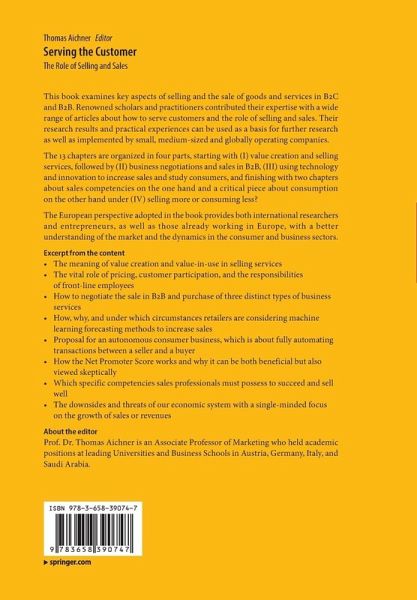 This book examines key aspects of selling and the sale of goods and services in B2C and B2B. Renowned scholars and practitioners contributed their expertise with a wide range of articles about how to serve customers and the role of selling and sales. Their research results and practical experiences can be used as a basis for further research as well as implemented by small, medium-sized and globally operating companies. The 13 chapters are organized in four parts, starting with (I) value creation and selling services, followed by (II) business negotiations and sales in B2B, (III) using technology and innovation to increase sales and study consumers, and finishing with two chapters about sales competencies on the one hand and a critical piece about consumption on the other hand under (IV) selling more or consuming less?The European perspective adopted in the book provides both international researchers and entrepreneurs, as well as those already working in Europe, with a better understanding of the market and the dynamics in the consumer and business sectors.