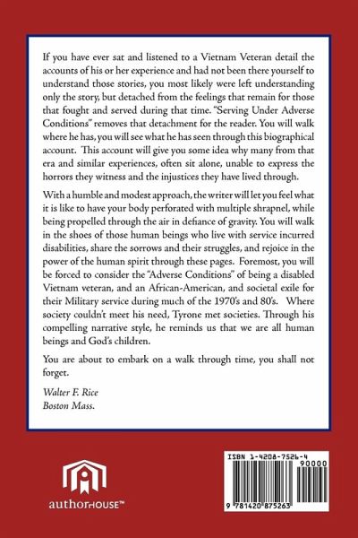 If you have ever sat and listened to a Vietnam Veteran detail the accounts of his or her experience and had not been there yourself to understand those stories, you most likely were left understanding only the story, but detached from the feelings that remain for those that fought and served during that time. "Serving Under Adverse Conditions" removes that detachment for the reader. You will walk where he has, you will see what he has seen through this biographical account. This account will give you some idea why many from that era and similar experiences, often sit alone, unable to express the horrors they witness and the injustices they have lived through. With a humble and modest approach, the writer will let you feel what it is like to have your body perforated with multiple shrapnel, while being propelled through the air in defiance of gravity. You will walk in the shoes of those human beings who live with service incurred disabilities, share the sorrows and their struggles, and rejoice in the power of the human spirit through these pages. Foremost, you will be forced to consider the "Adverse Conditions" of being a disabled Vietnam veteran, and an African-American, and societal exile for their Military service during much of the 1970's and 80's. Where society couldn't meet his need, Tyrone met societies. Through his compelling narrative style, he reminds us that we are all human beings and God's children. You are about to embark on a walk through time, you shall not forget. Walter F. Rice Boston Mass.