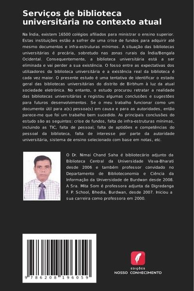 Na Índia, existem 16500 colégios afiliados para ministrar o ensino superior. Estas instituições estão a sofrer de uma crise de fundos para adquirir até mesmo documentos e infra-estruturas mínimos. A situação das bibliotecas universitárias é precária, sobretudo nas zonas rurais da Índia/Bengala Ocidental. Consequentemente, a biblioteca universitária está a ser eliminada e vai perder a sua existência. O fosso entre as expectativas dos utilizadores da biblioteca universitária e a existência real da biblioteca é cada vez maior. O presente estudo é uma tentativa de identificar o estado geral das bibliotecas universitárias do distrito de Birbhum à luz da atual sociedade eletrónica. No entanto, o estudo procurou retratar a realidade das bibliotecas universitárias e registou algumas conclusões e sugestões para futuros desenvolvimentos. Se o meu trabalho funcionar como um documento útil para a(s) pessoa(s) em causa e para as autoridades, então parece-me que foi um trabalho bem sucedido. As principais conclusões do estudo são as seguintes: crise de fundos, falta de infra-estruturas mínimas, incluindo as TIC, falta de pessoal, falta de aptidões e competências do pessoal da biblioteca, falta de interesse por parte da autoridade universitária, sistema de ensino selecionado com base em notas, etc.