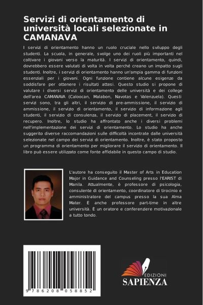 I servizi di orientamento hanno un ruolo cruciale nello sviluppo degli studenti. La scuola, in generale, svolge uno dei ruoli più importanti nel coltivare i giovani verso la maturità. I servizi di orientamento, quindi, dovrebbero essere valutati di volta in volta perché creano un impatto sugli studenti. Inoltre, i servizi di orientamento hanno un'ampia gamma di funzioni essenziali per i giovani. Ogni funzione contiene alcune esigenze da soddisfare per ottenere i risultati attesi. Questo studio si propone di valutare i diversi servizi di orientamento delle università e dei college dell'area CAMANAVA (Caloocan, Malabon, Navotas e Valenzuela). Questi servizi sono, tra gli altri, il servizio di pre-ammissione, il servizio di ammissione, il servizio di orientamento, il servizio di informazione agli studenti, il servizio di consulenza, il servizio di placement, il servizio di recupero. Inoltre, lo studio ha affrontato anche i diversi problemi nell'implementazione dei servizi di orientamento. Lo studio ha anche suggerito diverse raccomandazioni sulle difficoltà incontrate dalle università selezionate nel campo dei servizi di orientamento. Inoltre, è stato proposto un programma di orientamento per migliorare il servizio di orientamento. Il libro può essere utilizzato come fonte affidabile in questo campo di studio.