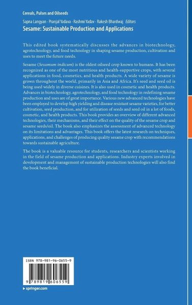 1. Origin and History of Sesame.- 2. Production and Trade of Sesame.- 3. Biotechnology of Sesame for Development of High Yielding Varieties.- 4. Agro-techniques for Cultivation of Sesame.- 5. Organic Production of Sesame: Status, Techniques, and Market.- 6. Techniques for Oil Extraction from Sesame and its Quality Analysis and comparison with other oilseed crops.- 7. Indigenous sesame products for food and health.- 8. Nutritional Quality of Sesame and its Health Implications.- 9. Food Applications of Sesame and new product development.- 10. Ameliorative Effect of using Sesame Oil against Toxicity.- 11. Biodiesel Production from Sesame Oil: Processes and Analysis.- 12. Sesame waste to valuable products.- 13. Towards Sustainable Agriculture of Sesame crop: Challenges and Recommendations.