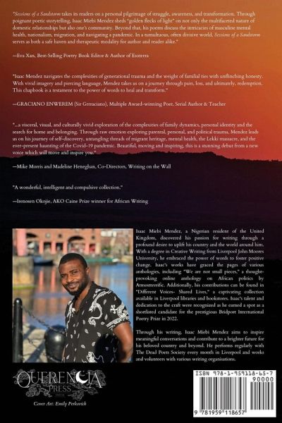 "Sessions of a Sandstorm takes its readers on a personal pilgrimage of struggle, awareness, and transformation. Through poignant poetic storytelling, Isaac Miebi Mendez sheds "golden flecks of light" on not only the multifaceted nature of domestic relationships but also one's community. Beyond that, his poems discuss the intricacies of masculine mental health, nationalism, migration, and navigating a pandemic. In a tumultuous, often divisive world, Sessions of a Sandstorm serves as both a safe haven and therapeutic modality for author and reader alike." -Eva Xan, Best-Selling Poetry Book Editor & Author of Esoterra "Isaac Mendez navigates the complexities of generational trauma and the weight of familial ties with unflinching honesty. With vivid imagery and piercing language, Mendez takes us on a journey through pain, loss, and ultimately, redemption. This chapbook is a testament to the power of words to heal and transform." -GRACIANO ENWEREM (Sir Grrraciano), Multiple Award-winning Poet, Serial Author & Teacher "...a visceral, visual, and culturally vivid exploration of the complexities of family dynamics, personal identity and the search for home and belonging. Through raw emotion exploring parental, personal, and political trauma, Mendez leads us on his journey of self-discovery, untangling threads of migrant heritage, mental health, the Lekki massacre, and the ever-present haunting of the Covid-19 pandemic. Beautiful, moving and inspiring, this is a stunning debut from a new voice which will move and inspire you." -Mike Morris and Madeline Heneghan, Co-Directors, Writing on the Wall "A wonderful, intelligent and compulsive collection." -Irenosen Okojie, AKO Caine Prize winner for African Writing
