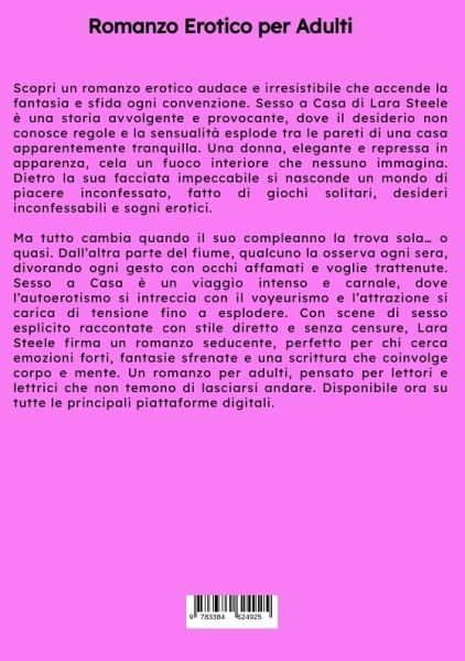 Scopri un romanzo erotico audace e irresistibile che accende la fantasia e sfida ogni convenzione. Sesso a Casa di Lara Steele è una storia avvolgente e provocante, dove il desiderio non conosce regole e la sensualità esplode tra le pareti di una casa apparentemente tranquilla. Una donna, elegante e repressa in apparenza, cela un fuoco interiore che nessuno immagina. Dietro la sua facciata impeccabile si nasconde un mondo di piacere inconfessato, fatto di giochi solitari, desideri inconfessabili e sogni erotici. Ma tutto cambia quando il suo compleanno la trova sola... o quasi. Dall'altra parte del fiume, qualcuno la osserva ogni sera, divorando ogni gesto con occhi affamati e voglie trattenute. Sesso a Casa è un viaggio intenso e carnale, dove l'autoerotismo si intreccia con il voyeurismo e l'attrazione si carica di tensione fino a esplodere. Con scene di sesso esplicito raccontate con stile diretto e senza censure, Lara Steele firma un romanzo seducente, perfetto per chi cerca emozioni forti, fantasie sfrenate e una scrittura che coinvolge corpo e mente. Un romanzo per adulti, pensato per lettori e lettrici che non temono di lasciarsi andare. Disponibile ora su tutte le principali piattaforme digitali.