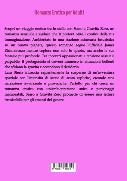 Scopri un viaggio erotico tra le stelle con Sesso a Gravità Zero, un romanzo sensuale e audace che ti porterà oltre i confini della tua immaginazione. Ambientato in una stazione mineraria futuristica su un nuovo pianeta, questo romanzo segue l'ufficiale James Zimmerman mentre esplora non solo lo spazio, ma anche le sue fantasie più profonde. Tra incontri appassionati e tensione sessuale palpabile, il protagonista si troverà immerso in situazioni bollenti che sfidano la gravità e accendono il desiderio.Lara Steele intreccia sapientemente la suspense di un'avventura spaziale con l'intensità di scene di sesso esplicito, creando una narrazione avvincente e provocante. Perfetto per chi cerca un romanzo erotico con un'ambientazione unica e personaggi memorabili, Sesso a Gravità Zero promette di essere una lettura irresistibile per gli amanti del genere.