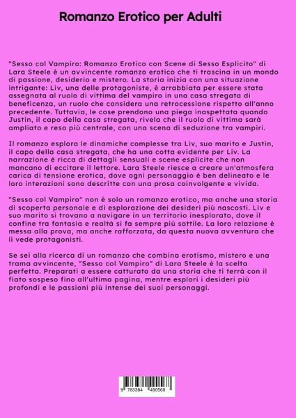 "Sesso col Vampiro: Romanzo Erotico con Scene di Sesso Esplicito" di Lara Steele è un avvincente romanzo erotico che ti trascina in un mondo di passione, desiderio e mistero. La storia inizia con una situazione intrigante: Liv, una delle protagoniste, è arrabbiata per essere stata assegnata al ruolo di vittima del vampiro in una casa stregata di beneficenza, un ruolo che considera una retrocessione rispetto all'anno precedente. Tuttavia, le cose prendono una piega inaspettata quando Justin, il capo della casa stregata, rivela che il ruolo di vittima sarà ampliato e reso più centrale, con una scena di seduzione tra vampiri.Il romanzo esplora le dinamiche complesse tra Liv, suo marito e Justin, il capo della casa stregata, che ha una cotta evidente per Liv. La narrazione è ricca di dettagli sensuali e scene esplicite che non mancano di eccitare il lettore. Lara Steele riesce a creare un'atmosfera carica di tensione erotica, dove ogni personaggio è ben delineato e le loro interazioni sono descritte con una prosa coinvolgente e vivida."Sesso col Vampiro" non è solo un romanzo erotico, ma anche una storia di scoperta personale e di esplorazione dei desideri più nascosti. Liv e suo marito si trovano a navigare in un territorio inesplorato, dove il confine tra fantasia e realtà si fa sempre più sottile. La loro relazione è messa alla prova, ma anche rafforzata, da questa nuova avventura che li vede protagonisti.Se sei alla ricerca di un romanzo che combina erotismo, mistero e una trama avvincente, "Sesso col Vampiro" di Lara Steele è la scelta perfetta. Preparati a essere catturato da una storia che ti terrà con il fiato sospeso fino all'ultima pagina, mentre esplori i desideri più profondi e le passioni più intense dei suoi personaggi.