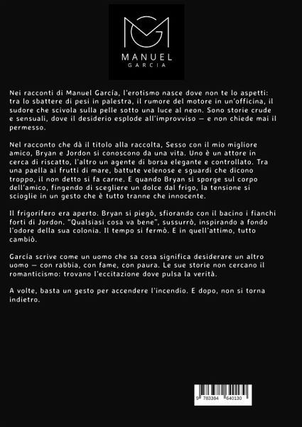 Nei racconti di Manuel García, l'erotismo nasce dove non te lo aspetti: tra lo sbattere di pesi in palestra, il rumore del motore in un'officina, il sudore che scivola sulla pelle sotto una luce al neon. Sono storie crude e sensuali, dove il desiderio esplode all'improvviso - e non chiede mai il permesso.Nel racconto che dà il titolo alla raccolta, Sesso con il mio migliore amico, Bryan e Jordon si conoscono da una vita. Uno è un attore in cerca di riscatto, l'altro un agente di borsa elegante e controllato. Tra una paella ai frutti di mare, battute velenose e sguardi che dicono troppo, il non detto si fa carne. E quando Bryan si sporge sul corpo dell'amico, fingendo di scegliere un dolce dal frigo, la tensione si scioglie in un gesto che è tutto tranne che innocente.Il frigorifero era aperto. Bryan si piegò, sfiorando con il bacino i fianchi forti di Jordon. "Qualsiasi cosa va bene", sussurrò, inspirando a fondo l'odore della sua colonia. Il tempo si fermò. E in quell'attimo, tutto cambiò.García scrive come un uomo che sa cosa significa desiderare un altro uomo - con rabbia, con fame, con paura. Le sue storie non cercano il romanticismo: trovano l'eccitazione dove pulsa la verità.A volte, basta un gesto per accendere l'incendio. E dopo, non si torna indietro.