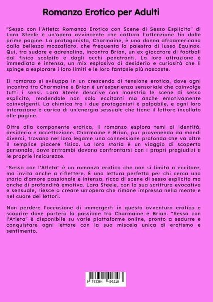 "Sesso con l'Atleta: Romanzo Erotico con Scene di Sesso Esplicito" di Lara Steele è un'opera avvincente che cattura l'attenzione fin dalle prime pagine. La protagonista, Charmaine, è una donna afroamericana dalla bellezza mozzafiato, che frequenta la palestra di lusso Equinox. Qui, tra sudore e adrenalina, incontra Brian, un ex giocatore di football dal fisico scolpito e dagli occhi penetranti. La loro attrazione è immediata e intensa, un mix esplosivo di desiderio e curiosità che li spinge a esplorare i loro limiti e le loro fantasie più nascoste.Il romanzo si sviluppa in un crescendo di tensione erotica, dove ogni incontro tra Charmaine e Brian è un'esperienza sensoriale che coinvolge tutti i sensi. Lara Steele descrive con maestria le scene di sesso esplicito, rendendole non solo eccitanti ma anche emotivamente coinvolgenti. La chimica tra i due protagonisti è palpabile, e ogni loro interazione è carica di un'energia sessuale che tiene il lettore incollato alle pagine.Oltre alla componente erotica, il romanzo esplora temi di identità, desiderio e accettazione. Charmaine e Brian, pur provenendo da mondi diversi, trovano nel loro legame una connessione profonda che va oltre il semplice piacere fisico. La loro storia è un viaggio di scoperta personale, dove entrambi devono confrontarsi con i propri pregiudizi e le proprie insicurezze."Sesso con l'Atleta" è un romanzo erotico che non si limita a eccitare, ma invita anche a riflettere. È una lettura perfetta per chi cerca una storia d'amore passionale e intensa, ricca di scene di sesso esplicito ma anche di profondità emotiva. Lara Steele, con la sua scrittura evocativa e sensuale, riesce a creare un'opera che rimane impressa nella mente e nel cuore dei lettori.Non perdere l'occasione di immergerti in questa avventura erotica e scoprire dove porterà la passione tra Charmaine e Brian. "Sesso con l'Atleta" è disponibile su varie piattaforme online, pronto a sedurre e conquistare ogni lettore con la sua miscela unica di erotismo e sentimento.