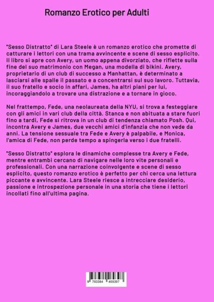 "Sesso Distratto" di Lara Steele è un romanzo erotico che promette di catturare i lettori con una trama avvincente e scene di sesso esplicito. Il libro si apre con Avery, un uomo appena divorziato, che riflette sulla fine del suo matrimonio con Megan, una modella di bikini. Avery, proprietario di un club di successo a Manhattan, è determinato a lasciarsi alle spalle il passato e a concentrarsi sul suo lavoro. Tuttavia, il suo fratello e socio in affari, James, ha altri piani per lui, incoraggiandolo a trovare una distrazione e a tornare in gioco.Nel frattempo, Fede, una neolaureata della NYU, si trova a festeggiare con gli amici in vari club della città. Stanca e non abituata a stare fuori fino a tardi, Fede si ritrova in un club di tendenza chiamato Posh. Qui, incontra Avery e James, due vecchi amici d'infanzia che non vede da anni. La tensione sessuale tra Fede e Avery è palpabile, e Monica, l'amica di Fede, non perde tempo a spingerla verso i due fratelli."Sesso Distratto" esplora le dinamiche complesse tra Avery e Fede, mentre entrambi cercano di navigare nelle loro vite personali e professionali. Con una narrazione coinvolgente e scene di sesso esplicito, questo romanzo erotico è perfetto per chi cerca una lettura piccante e avvincente. Lara Steele riesce a intrecciare desiderio, passione e introspezione personale in una storia che tiene i lettori incollati fino all'ultima pagina.