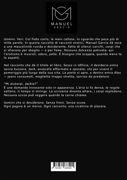 Uomini. Veri. Col fiato corto, le mani callose, lo sguardo che pesa più di mille parole. In questa raccolta di racconti erotici, Manuel García dà voce a una mascolinità ruvida e desiderante, fatta di silenzi carichi, corpi che si sfiorano per sbaglio - o per fame. Nessuna dolcezza patinata: qui l'erotismo è muscoli, odore, pelle. È bisogno che scoppia, quando meno te lo aspetti.Nel racconto che dà il titolo al libro, Sesso in Ufficio, il desiderio entra senza bussare. Jack, avvocato affermato e sposato, sta per vivere il pomeriggio più lungo della sua vita. La porta si apre, e dentro entra Alex - jeans consumati, maglietta troppo stretta, sorriso da predatore."Mi aiuterai, Jackie?"È una domanda innocente solo in apparenza. L'aria si fa densa, le regole saltano, il tempo si stringe. La scrivania diventa altare, i corpi esplodono. Nessuna scusa può reggere quando la carne chiama.Uomini che si desiderano. Senza freni. Senza scuse.Ogni pagina è un morso. Ogni racconto, una cicatrice di piacere.