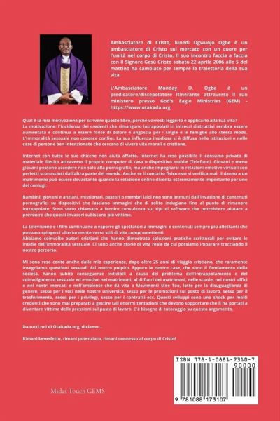 Il sesso nel tempio di Dio - 15 semplici modi per capire, identificare e superare l' immoralità sessuale e le trappole emotive nella tua vita è stato scritto come un libro pratico su "come fare" per aiutarti a porre fine all'intreccio sessuale ed emotivo per sempre. Qual è la mia motivazione per scrivere questo libro, perché vorresti leggerlo e applicarlo alla tua vita? La motivazione : T ha incidenza di credenti rimanere intrappolati in coinvolgimenti distruttive sembra essere aumentato e continua ad essere una fonte di dolore e di angoscia per i single e le famiglie. L'immoralità sessuale non conosce confini. La sua influenza insidiosa si è diffusa nelle istituzioni e nelle case di persone ben intenzionate che cercano di vivere una vita morale e cristiana. Internet con tutte le sue chicche non aiuta affatto le cose. Internet ha reso possibile il consumo privato di materiale illecito tramite il proprio computer di casa o dispositivo mobile (telefono). Sia i giovani che i vecchi possono accedere non solo alla pornografia ma anche impegnarsi in relazioni emotive virtuali con estranei completi dall'altra parte del mondo. Anche se il contatto fisico non si verifica mai, il danno a un matrimonio può essere devastante quando la relazione online diventa seducentemente importante per uno dei coniugi. Bambini, giovani e anziani, missionari, pastori o laici non sono immuni dall'invasione di contenuti pornografici su dispositivi che lasciano immagini che di solito rimangono al punto di rimanere intrappolati. Sono stato chiamato a consigliare tipi di software che potrebbero aiutare a impedire a questi invasori di subire più vittime. La televisione e i film continuano a esporre gli spettatori a immagini e contenuti sempre più allettanti che possono spingerci ulteriormente verso stili di vita compromettenti. Abbiamo ingaggiato autori cristiani che hanno dimostrato soluzioni pratiche scritturali per evitare le insidie ¿¿dell'immoralità sessuale. Ci sono anche storie di vita reale che possiamo imparare nel tracciare il nostro corso. Mi sono anche reso conto dalle mie esperienze personali dopo oltre 25 anni di viaggio cristiano che raramente insegniamo sulle questioni sessuali dal nostro pulpito. Eppure le nostre case, che sono il fondamento della società, hanno subito conseguenze indicibili a causa della questione dell'intrappolamento e dell'entusiasmo sessuali ed emotivi nei matrimoni, nei matrimoni esterni, nelle scuole, nei nostri uffici o nei nostri mercati e nell'ambiente che ha dato vita Mee Too Movements, lotte sulla disuguaglianza di genere, Sex for Marks nelle nostre università, Sex for promozioni sul posto di lavoro, Sex for Transfer, Sex for privileges, Sex for Contracts ecc. Questi sviluppi sono uno shock per molti credenti che non sono preparati a gestire tali enormi tentazioni che devono sopportare, il che le ha portate a diventare vittime delle pressioni sul posto di lavoro. C'è bisogno di tutoraggio su questo argomento.