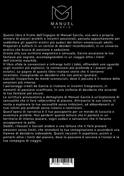 Questo libro nasce da un'idea di Manuel García, una vera e propria miniera di piaceri proibiti e incontri passionali, pensata appositamente per soddisfare gli appetiti erotici più audaci dei lettori adulti omosessuali.Preparatevi a tuffarvi in un vortice di desideri inconfessabili, in un universo erotico che brucia di passione e seduzione. Grazie alla sua scrittura magnetica e sensuale, García accarezza le vostre fantasie più segrete, accompagnandovi in un viaggio oltre i limiti dell'intimità maschile.Il libro sfida le convenzioni e infrange tutti i tabù, offrendo uno sguardo agli incontri più esplosivi, ai legami più profondi e ai piaceri più estatici. Le pagine di questo libro rivelano storie che vi terranno incantati, risvegliando un desiderio che non potrete ignorare.Lasciatevi trasportare da mondi sconosciuti, dove il peccato è il motore delle emozioni più intense. I personaggi creati da García si rivelano in incontri trasgressivi, in momenti di passione sconfinata, in una sinfonia di desiderio che accende le vostre fantasie più oscure.La scrittura provocatoria e dettagliata di Manuel García è un'esplosione di sensualità che vi farà rabbrividire di piacere. Attraverso le sue storie, vi invita a esplorare la vostra sessualità senza inibizioni, ad abbandonarvi ai vostri istinti più profondi senza rimorsi o restrizioni.Quest'opera di narrativa è il vostro passaporto per un mondo di lussuria e avventure proibite. Non perdetevi questa lettura che vi porterà in un territorio di piacere intenso, sogni audaci e sensazioni che vi faranno accapponare la pelle.Sedetevi, rilassatevi e lasciatevi andare a una lettura che vi farà provare emozioni senza limiti, che stimolerà la vostra immaginazione e accenderà una fiamma di desiderio indomabile. Questi racconti vi aspettano, pronti a portarvi oltre i limiti del piacere, dove la passione è sovrana e l'estasi è la vostra compagna di viaggio.