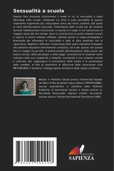Questo libro presenta criticamente il modo in cui la sessualità è stata affrontata nelle scuole, riflettendo sui limiti e sulle possibilità di questo importante argomento per l'educazione civica dei nostri studenti. Dal punto di vista dell'educazione sessuale, l'importanza della scuola per gli studenti durante l'adolescenza è pressante, in quanto è il luogo in cui trascorrono la maggior parte del loro tempo, dove si costruiscono le prime relazioni sociali e spesso le prime relazioni affettive. Diventa quindi un luogo privilegiato e favorevole per affrontare la sessualità e tutte le altre questioni che la riguardano. Vogliamo rafforzare l'importanza delle azioni educative finalizzate alle politiche educative nell'ambiente scolastico, ed è per questo che questo libro si rivolge, tra gli altri, ai professionisti dell'educazione, della salute, del lavoro sociale, della psicologia e della legge. Considerare lo studente come individuo nella sua singolarità e integrità, includendo il suo contesto sociale e culturale, per raggiungere la promozione della salute e la prevenzione delle malattie, al fine di consentire la diffusione delle conoscenze sulle MST/HIV/AIDS e facilitare il dialogo aperto all'interno dello spazio scolastico.