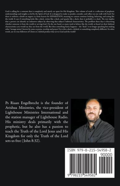 God is calling for a remnant that is completely and utterly set apart for His Kingdom. This volume of work is a collection of prophetic understandings and insights as led by the Spirit of God. It is designed to make us ponder, consider, and reflect on our walk with God. For there is without a doubt an urgent cry from heaven for SEPARATION, meaning we cannot continue looking, behaving, and acting like the world. It says if something looks like a duck, swims like a duck, and quacks like a duck, then it probably is a duck. The test implies that a person can identify an unknown subject by observing that subject's habitual characteristics. The problem these days is discerning whether someone is from the world or serving God. On the one hand, so many tend to behave like the world, so based on their habitual characteristics, you would say they are from the world. But then something funny happens - the "duck" is no longer quacking but making other "strange noises", known by some as praise, worship and prayer! So is this a duck, a hybrid, or something completely different? In other words, are we true followers of Christ or a hybrid product that serves God and the world?