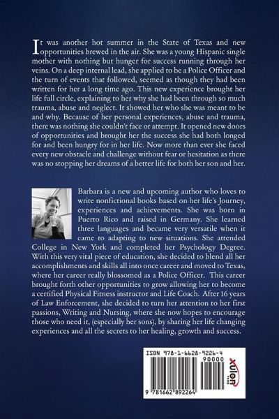 It was another hot summer in the State of Texas and new opportunities brewed in the air. She was a young Hispanic single mother with nothing but hunger for success running through her veins. On a deep internal lead, she applied to be a Police Officer and the turn of events that followed, seemed as though they had been written for her a long time ago. This new experience brought her life full circle, explaining to her why she had been through so much trauma, abuse and neglect. It showed her who she was meant to be and why. Because of her personal experiences, abuse and trauma, there was nothing she couldn't face or attempt. It opened new doors of opportunities and brought her the success she had both longed for and been hungry for in her life. Now more than ever she faced every new obstacle and challenge without fear or hesitation as there was no stopping her dreams of a better life for both her son and her. Barbara is a new and upcoming author who loves to write nonfictional books based on her life's Journey, experiences and achievements. She was born in Puerto Rico and raised in Germany. She learned three languages and became very versatile when it came to adapting to new situations. She attended College in New York and completed her Psychology Degree. With this very vital piece of education, she decided to blend all her accomplishments and skills all into once career and moved to Texas, where her career really blossomed as a Police Officer. This career brought forth other opportunities to grow allowing her to become a certified Physical Fitness instructor and Life Coach. After 16 years of Law Enforcement, she decided to turn her attention to her first passions, Writing and Nursing, where she now hopes to encourage those who need it, (especially her sons), by sharing her life changing experiences and all the secrets to her healing, growth and success.