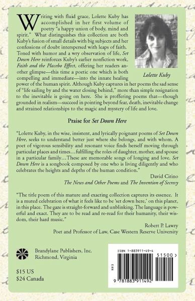 In this collection of poetry, Canadian poet Lolette Kuby succeeds in pointing beyond fear, death, and inevitable change and strained relationships to the magic and mystery of life and love. What distinguishes this collection are both Kuby's fusion of small details with big subjects and her confessions of doubt interspersed with leaps of faith. This book captures the healing power of the human spirit.