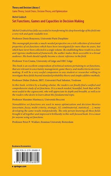 The book provides a thorough treatment of set functions, games and capacities as well as integrals with respect to capacities and games, in a mathematical rigorous presentation and in view of application to decision making. After a short chapter introducing some required basic knowledge (linear programming, polyhedra, ordered sets) and notation, the first part of the book consists of three long chapters developing the mathematical aspects. This part is not related to a particular application field and, by its neutral mathematical style, is useful to the widest audience. It gathers many results and notions which are scattered in the literature of various domains (game theory, decision, combinatorial optimization and operations research). The second part consists of three chapters, applying the previous notions in decision making and modelling: decision under uncertainty, decision with multiple criteria, possibility theory and Dempster-Shafer theory.