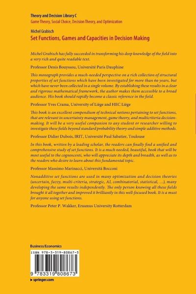The book provides a thorough treatment of set functions, games and capacities as well as integrals with respect to capacities and games, in a mathematical rigorous presentation and in view of application to decision making. After a short chapter introducing some required basic knowledge (linear programming, polyhedra, ordered sets) and notation, the first part of the book consists of three long chapters developing the mathematical aspects. This part is not related to a particular application field and, by its neutral mathematical style, is useful to the widest audience. It gathers many results and notions which are scattered in the literature of various domains (game theory, decision, combinatorial optimization and operations research). The second part consists of three chapters, applying the previous notions in decision making and modelling: decision under uncertainty, decision with multiple criteria, possibility theory and Dempster-Shafer theory.