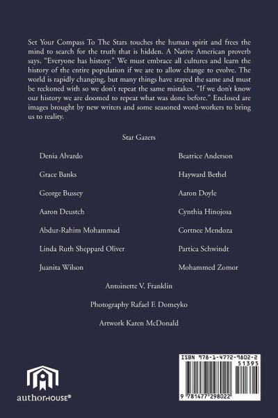 Set Your Compass To The Stars touches the human spirit and frees the mind to search for the truth that is hidden. A Native American proverb says, "Everyone has history." We must embrace all cultures and learn the history of the entire population if we are to allow change to evolve. The world is rapidly changing, but many things have stayed the same and must be reckoned with so we don't repeat the same mistakes. "If we don't know our history we are doomed to repeat what was done before." Enclosed are images brought by new writers and some seasoned word-workers to bring us to reality.