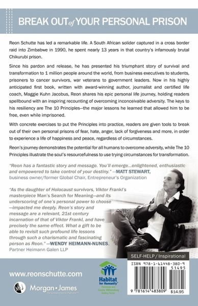 Reon Schutte has led a remarkable life. A South African solider captured in a cross border raid into Zimbabwe in 1990, he spent nearly 13 years in that country's infamously brutal Chikurubi prison. Since his pardon and release, he has presented his triumphant story of survival and transformation to 1 million people around the world, from business executives to students, prisoners to cancer survivors, war veterans to government leaders. Now in his highly anticipated first book, written with award-winning author, journalist and certified life coach, Maggie Kuhn Jacobus, Reon shares his epic personal life journey, holding readers spellbound with an inspiring recounting of overcoming inconceivable adversity. The keys to his resiliency are The 10 Principles--the major lessons he learned that allowed him to be free, even while imprisoned. With concrete exercises to put the Principles into practice, readers are given tools to break out of their own personal prisons of fear, hate, anger, lack of forgiveness and more, in order to experience a life of happiness and peace, regardless of circumstances. Reon’s journey demonstrates the potential for all humans to overcome adversity, while The 10 Principles illustrate the soul’s resourcefulness to use trying circumstances for transformation.