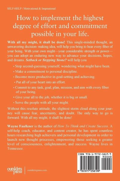 "With All My Might," It Shall Be Done! A single-minded thought, an unwavering decision-making idea. Implementing the highest degree of effort and commitment humanly possible. Bring to bear every fiber of your being. A profound gut check measures your ability to stay the course and not turn back, no matter the difficulty. You will persevere in the face of fear, uncertainty, and doubt. Author Wayne Faulkner's second book inspires and persuades readers to embrace their deepest level of faithfulness.