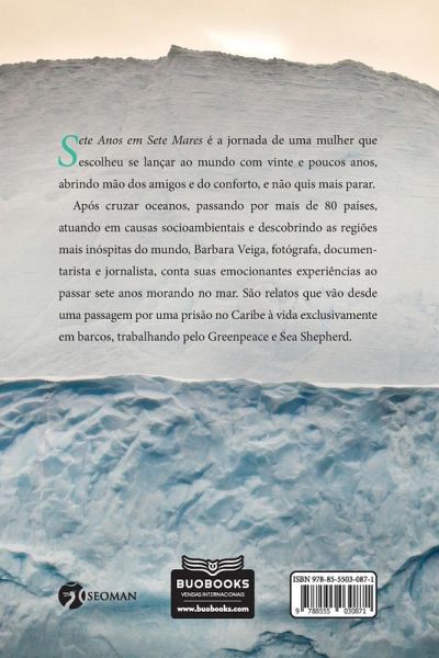 Sete Anos em Sete Mares é a jornada de uma mulher que escolheu se lançar ao mundo com vinte e poucos anos, abrindo mão dos amigos e do conforto, para se entregar a causas que possam ajudar a melhorar o planeta. Após cruzar oceanos, atuar em causas socioambientais em mais de 80 países e visitar as regiões mais inóspitas do mundo, Barbara Veiga, fotógrafa, documentarista e jornalista, conta suas emocionantes experiências ao passar sete anos morando no mar. São relatos sobre a paixão pela vida marinha e seus ensinamentos, aprender a confiar nas pessoas, ser uma mulher em um meio predominantemente masculino, a solidão e saudade de casa, aventuras em meio a piratas e prisões no Caribe, mas, acima de tudo, sobre uma vida trabalhando em causas junto ao Greenpeace, Sea Shepherd e Avaaz.