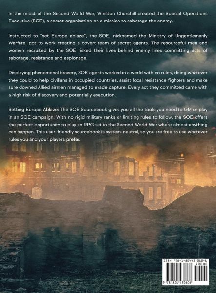 In the midst of the Second World War, Winston Churchill created the Special Operations Executive (SOE), a secret organisation on a mission to sabotage the enemy. Instructed to "set Europe ablaze", the SOE, nicknamed the Ministry of Ungentlemanly Warfare, got to work creating a covert team of secret agents. The resourceful men and women recruited by the SOE risked their lives behind enemy lines committing acts of sabotage, resistance and espionage. Displaying phenomenal bravery, SOE agents worked in a world with no rules, doing whatever they could to help civilians in occupied countries, assist local resistance fighters and make sure downed Allied airmen managed to evade capture. Every act they committed came with a high risk of discovery and potentially execution. Setting Europe Ablaze: The SOE Sourcebook gives you all the tools you need to GM or play in an SOE campaign. With no rigid military ranks or limiting rules to follow, the SOE offers the perfect opportunity to play an RPG set in the Second World War where almost anything can happen. This user-friendly sourcebook is system-neutral, so you are free to use whatever rules you and your players prefer.