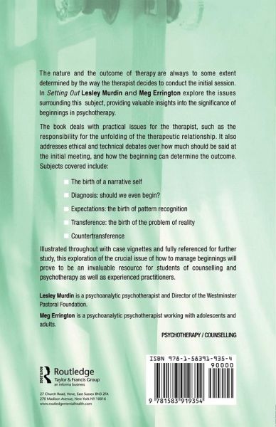 The nature and the outcome of therapy are always to some extent determined by the way the therapist decides to conduct the initial session. In Setting Out Lesley Murdin and Meg Errington explore the issues surrounding this subject, providing valuable insights into the significance of beginnings in psychotherapy. The book deals with practical issues for the therapist, such as the responsibility for the unfolding of the therapeutic relationship. It also addresses ethical and technical debates over how much should be said at the initial meeting, and how the beginning can determine the outcome. Subjects covered include: *The birth of a narrative self *Diagnosis: should we even begin? *Expectations: the birth of pattern recognition *Transference: the birth of the problem of reality Illustrated throughout with case vignettes, this exploration of the crucial issue of how to manage beginnings will be prove an invaluable resource for students of counselling and psychotherapy as well as experienced practitioners.