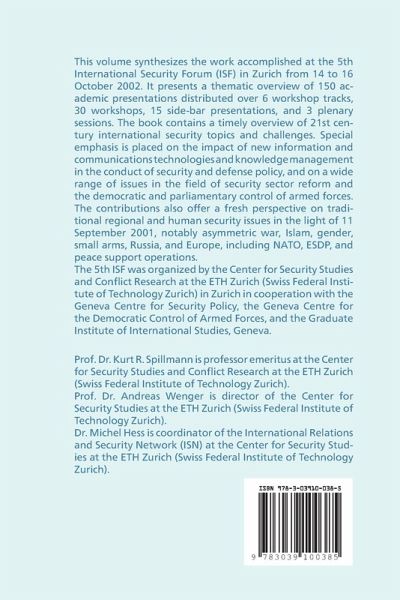 This volume synthesizes the work accomplished at the 5 th International Security Forum (ISF) in Zurich from 14 to 16 October 2002. It presents a thematic overview of 150 academic presentations distributed over 6 workshop tracks, 30 workshops, 15 side-bar presentations, and 3 plenary sessions. The book contains a timely overview of 21 st century international security topics and challenges. Special emphasis is placed on the impact of new information and communications technologies and knowledge management in the conduct of security and defense policy, and on a wide range of issues in the field of security sector reform and the democratic and parliamentary control of armed forces. The contributions also offer a fresh perspective on traditional regional and human security issues in the light of 11 September 2001, notably asymmetric war, Islam, gender, small arms, Russia, and Europe, including NATO, ESDP, and peace support operations.