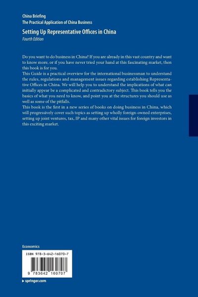Do you want to do business in China? If you are already in this vast country and want to know more, or if you have never tried your hand at this fascinating market, then this book is for you. This Guide is a practical overview for the international businessman to understand the rules, regulations and management issues regarding establishing Representative Offices in China. We will help you to understand the implications of what can initially appear be a complicated and contradictory subject. This book tells you the basics of what you need to know, and point you at the structures you should use as well as some of the pitfalls. This book is the first in a new series of books on doing business in China, which will progressively cover such topics as setting up wholly foreign-owned enterprises, setting up joint ventures, tax, IP and many other vital issues for foreign investors in this exciting market.