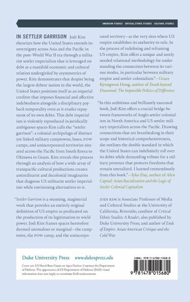 In Settler Garrison Jodi Kim theorizes how the United States extends its sovereignty across Asia and the Pacific in the post-World War II era through a militarist settler imperialism that is leveraged on debt as a manifold economic and cultural relation undergirded by asymmetries of power. Kim demonstrates that despite being the largest debtor nation in the world, the United States positions itself as an imperial creditor that imposes financial and affective indebtedness alongside a disciplinary payback temporality even as it evades repayment of its own debts. This debt imperialism is violently reproduced in juridically ambiguous spaces Kim calls the "settler garrison": a colonial archipelago of distinct yet linked military camptowns, bases, POW camps, and unincorporated territories situated across the Pacific from South Korea to Okinawa to Guam. Kim reveals this process through an analysis of how a wide array of transpacific cultural productions creates antimilitarist and decolonial imaginaries that diagnose US militarist settler imperialism while envisioning alternatives to it.