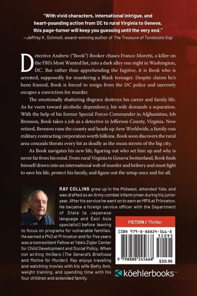 "A masterful tale of corruption, conspiracy, and redemption." -Jeffrey K. Schmoll, award-winning author of The Treasure of Tundavala Gap "...an engaging page-turner..." -Karen Hughes, former White House communications director Detective Andrew ("Book") Booker chases Franco Moretti, a killer on the FBI's Most Wanted list, into a dark alley one night in Washington, DC. But rather than apprehending the fugitive, it is Book who is arrested, supposedly for murdering a Black teenager. Despite claims he's been framed, Book is forced to resign from the DC police and narrowly escapes a conviction for murder. The emotionally shattering disgrace destroys his career and family life. As he veers toward alcoholic dependency, his wife demands a separation. With the help of his former Special Forces Commander in Afghanistan, Jeb Bronson, Book takes a job as a detective in Jefferson County, Virginia. Now retired, Bronson runs the county and heads up Ares Worldwide, a family-run military contracting corporation worth billions. Book soon discovers the rural area conceals threats every bit as deadly as the mean streets of the big city. As Book navigates his new life, figuring out who set him up and why is never far from his mind. From rural Virginia to Geneva Switzerland, Book finds himself drawn into an international web of murder and bribery and must fight to save his life, protect his family, and figure out the setup once and for all.
