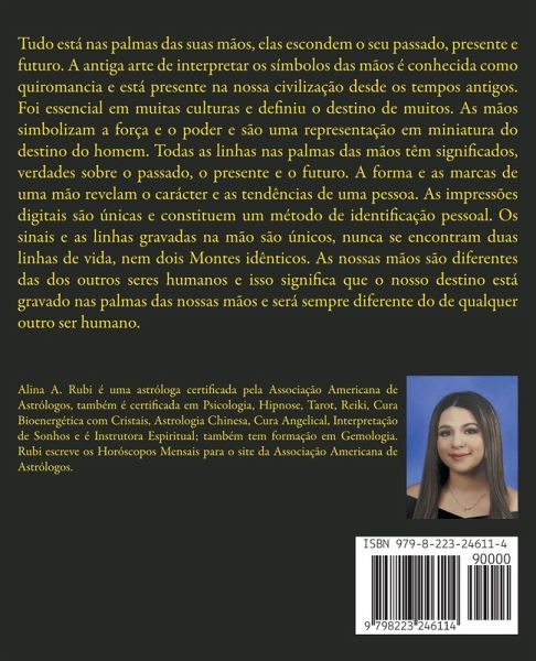 Tudo está nas palmas das suas mãos, elas escondem o seu passado, presente e futuro. A antiga arte de interpretar os símbolos das mãos é conhecida como quiromancia e está presente na nossa civilização desde os tempos antigos. Foi essencial em muitas culturas e definiu o destino de muitos. As mãos simbolizam a força e o poder e são uma representação em miniatura do destino do homem. Todas as linhas nas palmas das mãos têm significados, verdades sobre o passado, o presente e o futuro. A forma e as marcas de uma mão revelam o carácter e as tendências de uma pessoa. As impressões digitais são únicas e constituem um método de identificação pessoal. Os sinais e as linhas gravadas na mão são únicos, nunca se encontram duas linhas de vida, nem dois Montes idênticos. As nossas mãos são diferentes das dos outros seres humanos e isso significa que o nosso destino está gravado nas palmas das nossas mãos e será sempre diferente do de qualquer outro ser humano.