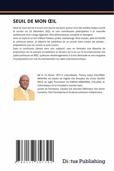 Seuil de mon oeil est à la fois une oeuvre narrative autour d'un fait sociétal majeur qu'est le scrutin du 20 Décembre 2023, et une contribution participative à la nouvelle architecture d'un Congo régénéré, rêvé démocratique, prospère et émergent.Avec un style et un ton mêlant Pasteur, poète, dramaturge, libre citoyen, père de famille et politique acteur, je dépeins les péripéties de ce scrutin dans toutes ses phases : préparatoire, jour du scrutin et post scrutin.Dans la conclusion j'émets mon avis subjectif, avec en liminaire une ébauche de proposition de loi portant complément et révision de la loi sur le fonctionnement des partis politiques en RDC, quelques réaménagements à la lois électorale et une vingtaine de propositions en vue du redressement du cadre macroéconomique.
