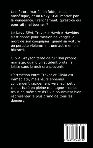 Une future mariée en fuite, soudain amnésique, et un Navy SEAL motivé par la vengeance. Franchement, qu'est-ce qui pourrait mal tourner ? Le Navy SEAL Trevor Hawk Hawkins s'est donné pour mission de venger la mort de son coéquipier, quand sa voiture en percute violemment une autre en plein blizzard. Olivia Grayson tente de fuir son propre mariage, quand un accident brutal la laisse sans le moindre souvenir. L'attraction entre Trevor et Olivia est immédiate, mais leurs ennemis convergent rapidement vers leur petit chalet isolé en pleine montagne - et les trous de mémoire d'Olivia pourraient bien représenter le plus grand de tous les dangers.