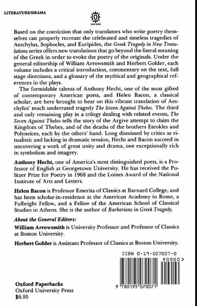 The formidable talents of Anthony Hecht, one of the most gifted of contemporary American poets, and Helen Bacon, a classical scholar, are here brought to bear on this vibrant translation of Aeschylus' much underrated tragedy The Seven Against Thebes. The third and only remaining play in a trilogy dealing with related events, The Seven Against Thebes tells the story of the Argive attempt to claim the Kingdom of Thebes, and of the deaths of the brothers Eteocles and Polyneices, each by the others hand. Long dismissed by critics as ritualistic and lacking in dramatic tension, Seven Against Thebes is revealed by Hecht and Bacon as a work of great unity and drama, one exceptionally rich in symbolism and imagery.