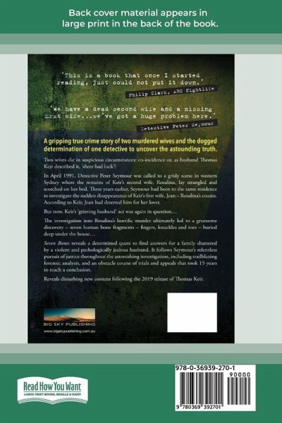 Seven Bones is the story of one of the more bizarre murder investigations in Australia's history. Two wives die in suspicious circumstances: co-incidence or, as husband Thomas Keir describes it, 'bad luck'? Three years after Thomas Keir alleged his first wife Jean deserted him and her young son for another man, his second wife Rosalina, Jean's cousin, lay scorched and strangled on her bed. Arriving on the scene, Detective Peter Seymour realised he was either dealing with the world's unluckiest husband, or a serial wife killer. While Keir was remarkably found 'not guilty' of Rosalina's murder, despite a clear-cut case, her death unlocked the mystery of Jean's disappearance. A subsequent police investigation lead to the discovery of seven small fragments of Jean's bones - fingers, knuckles and toes - buried deep under the same house in which Rosalina died. Keir's 'grieving husband' act was suddenly in question. The investigation revealed Thomas Kier was a man so jealous he hated even his own baby son touching his wife, Jean. A man so possessive he threatened he would cut her up and feed her to the dogs if she ever left him. A man who thought he could commit the perfect crime and publicly taunted the police through the media. Written through the eyes of Detective Peter Seymour, Seven Bones follows his relentless pursuit of justice and his own family sacrifices, through the drama of the police investigation into Jean's death, and the three trials, convictions, and appeals that would take fifteen years to reach their final conclusion.