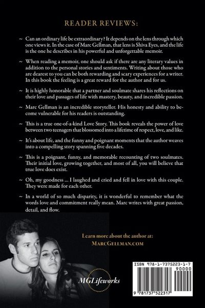 An unforgettable true love story. A memoir of love and resilience, grief and loss, and forty-six years of puppy love told with humor, laughter, and tears.Can an ordinary life be extraordinary? Through the eyes of Marc Gellman - what he calls his "Shiva Eyes" - the answer is yes. In this deeply moving and inspirational memoir, Gellman recounts the remarkable forty-six-year journey he shared with his wife, Barbara, from their teenage puppy love on a summer beach to the joys and challenges of a marriage that endured through every season of life.Readers are invited into a story that is at once intimate and universal. A boy from Brooklyn meets a girl from The Bronx, and together they create a life full of laughter, devotion, and playful adventures. From the excitement of young love to newlywed life in New York City, from raising children in the suburbs to rediscovering each other as empty nesters, Marc and Barbara's story of their lifelong romance is a celebration of marriage, family, and parenthood.Woven into their joy are the hills and valleys of real life. The unflinching struggle against illness, the heartbreak of loss, are the author's search for meaning through this memoir of strength in illness. With candor and warmth, Gellman reveals not only the strength of his wife's spirit but also the depth of their bond, uncovering layers of love he never fully grasped until facing their most difficult trials.Both poignant and uplifting, this Jewish biography is more than a romance. It's a moving story of love and loss that celebrates the beauty of ordinary days, hope and healing through love, resilience of partnership, and the promise made by a husband, "I will tell our story to the world; that every day we shared was special."For readers of love, legacy, and loss and are drawn to inspirational romantic love stories, this book is a touching and timeless reminder that true love is found in life's simplest moments. This uplifting marriage memoir will make you laugh, cry, believe in love again, and linger in your heart long after the final page.
