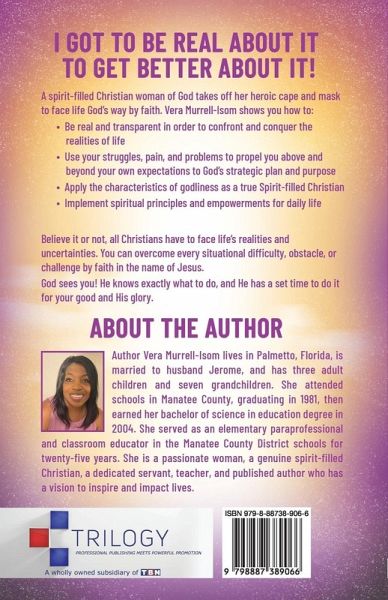 I GOT TO BE REAL ABOUT IT TO GET BETTER ABOUT IT! A spirit-filled Christian woman of God takes off her heroic cape and mask to face life God's way by faith. Vera Murrell-Isom shows you how to:Be real and transparent in order to confront and conquer the realities of life Use your struggles, pain, and problems to propel you above and beyond your own expectations to God's strategic plan and purpose Apply the characteristics of godliness as a true Spirit-filled Christian Implement spiritual principles and empowerments for daily life Believe it or not, all Christians have to face life's realities and uncertainties. You can overcome every situational difficulty, obstacle, or challenge by faith in the name of Jesus. God sees you! He knows exactly what to do, and He has a set time to do it for your good and His glory.