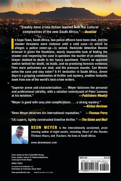 In Deon Meyer's "Thirteen Hours," which won the Barry Award for Best Thriller in 2011, Cape Town homicide detective Bennie Griessel struggled to solve the murder of an American girl, find her missing friend, and avoid drinking again, all in a single day. In "Seven Days," Griessel is given another nearly impossible task. Two police officers have been shot, and the department has received emails from the shooter alleging corruption and a cover up in a cold case. The shooter quotes scripture and threatens more violence until the cold case is solved. The case in question is the murder of Hanneke Sloet, an ambitious lawyer stabbed to death in her luxury apartment. There's no apparent motive, no leads, and no promising forensic evidence. There's no sign of a struggle either; the front door to Sloet's apartment was not damaged, so Griessel is sure she either knew the killer, or the killer had a key. All in all, the original inspector seems to have done a thorough job, only to come up empty. The one piece of evidence that Griessel finds promising is a set of provocative professional photos of herself that Sloet kept in her apartment. Perhaps jealous rage was the motive? Sloet's ex-boyfriend, who works at a vineyard making barrels, had the strength, the connection, and the access to the right type of blade, but he has an alibi that checks out. And then, another cop is shot. Pressure ramps up on Griessel, and on his feisty colleague, Captain Mbali Kaleni, who is hunting the shooter, trying desperately to find a connection to Sloet as the number of injured rise. The emails keep coming, and the shooter reaches out to the media. And then, as if Griessel's life isn't complicated enough, his girlfriend Alexa Bernard, a singer who was in "Thirteen Hours," falls off the wagon herself thanks to the pressure of a big comeback concert. "Seven Days" is another fantastic novel from Deon Meyer, one of international crime fiction's stars. He has won major awards and is gaining new fans here, as his Barry Award and successful tour for "Thirteen Hours" can attest. "Seven Days" is a completely gripping read, a brilliant amalgam of thriller and mystery.