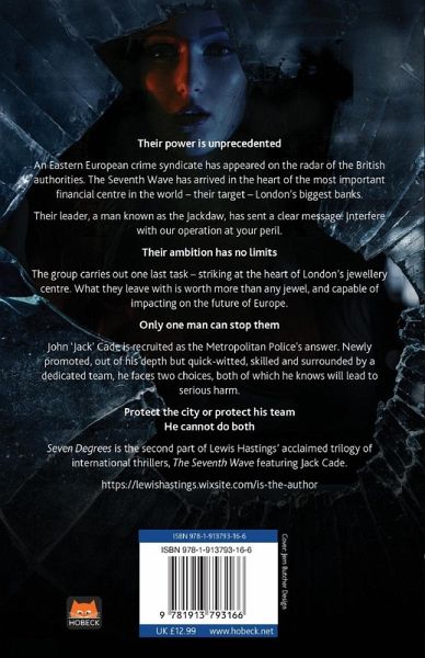 Their power is unprecedented An Eastern European crime syndicate has appeared on the radar of the British authorities. The Seventh Wave has arrived in the heart of the most important financial centre in the world - their target - London's biggest banks. Their leader, a man known as the Jackdaw, has sent a clear message. Interfere with our operation at your peril. Their ambition has no limits The group carries out one last task - striking at the heart of London's jewellery centre. What they leave with is worth more than any jewel and capable of impacting on the future of Europe. Only one man can stop them John 'Jack' Cade is recruited as the Metropolitan Police's answer. Newly promoted, out of his depth but quick-witted, skilled and surrounded by a dedicated team, he faces two choices, both of which he knows will lead to serious harm. Protect the city or protect his team He cannot do both Seven Degrees is the second part of Lewis Hastings' acclaimed trilogy of international thrillers, The Seventh Wave featuring Jack Cade.