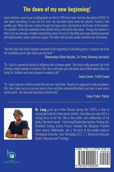Imani Andrews came home to Indianapolis on March 19th from New York the day before COVID 19 shut down everything. It was the first time she had been home since her parents' funeral a few months ago. When she was rooting through her hope chest, she found an old tin box at the bottom. The contents of the box contained some family history she had no idea about. Among the contents a letter from an attorney, a leather-bound King James Version of the Bible and seven identical journals with black leather covers and brass clasps. The letter and journals would transform her life forever. While this is a work of historical fiction, it was inspired by true events involving seven courageous women fighting to protect and provide educational opportunities to their Black brothers and sisters during a time of social discord and racial tension. Specific information from the early 1900s is limited, but I believe the depictions accurately portray the time's events and attitudes. I had no direct experience with any of these seven women, so I needed inspiration for their characteristics or dispositions. So, I modeled the personalities of the seven women after those of my seven sisters. It was important to show the individual strength, perseverance, and courage of each of the women. This story looks at the events of 100 years ago. There has been a significant change in the lives of African Americans over the past century, but given the events of the last decade, African Americans are reminded that we still have a long way to go. Always at the forefront of our minds: freedom is never free! Dr. Lang grew up in New Orleans during the 1960's, a time of segregated and less than equal schools. Education was and still is a strong force in her life. She is the author and collaborator of six books; the most recent - Colorizing Restorative Justice: Voicing Our Realities! (Living Justice Press) received the Benjamin Franklin silver award. Additionally, she is the host of the weekly podcast Workplace Diversity, Your Workplace D.I.E.T. T. (Diversity Inclusion Equity Tolerance and Training). "A superb novel" Dhomonique Ricks Murphy