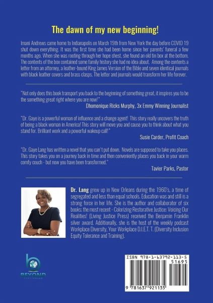 Imani Andrews came home to Indianapolis on March 19th from New York the day before COVID 19 shut down everything. It was the first time she had been home since her parents' funeral a few months ago. When she was rooting through her hope chest, she found an old tin box at the bottom. The contents of the box contained some family history she had no idea about. Among the contents a letter from an attorney, a leather-bound King James Version of the Bible and seven identical journals with black leather covers and brass clasps. The letter and journals would transform her life forever. While this is a work of historical fiction, it was inspired by true events involving seven courageous women fighting to protect and provide educational opportunities to their Black brothers and sisters during a time of social discord and racial tension. Specific information from the early 1900s is limited, but I believe the depictions accurately portray the time's events and attitudes. I had no direct experience with any of these seven women, so I needed inspiration for their characteristics or dispositions. So, I modeled the personalities of the seven women after those of my seven sisters. It was important to show the individual strength, perseverance, and courage of each of the women. This story looks at the events of 100 years ago. There has been a significant change in the lives of African Americans over the past century, but given the events of the last decade, African Americans are reminded that we still have a long way to go. Always at the forefront of our minds: freedom is never free! Dr. Lang grew up in New Orleans during the 1960's, a time of segregated and less than equal schools. Education was and still is a strong force in her life. She is the author and collaborator of six books; the most recent - Colorizing Restorative Justice: Voicing Our Realities! (Living Justice Press) received the Benjamin Franklin silver award. Additionally, she is the host of the weekly podcast Workplace Diversity, Your Workplace D.I.E.T. T. (Diversity Inclusion Equity Tolerance and Training). "A superb novel" Dhomonique Ricks Murphy