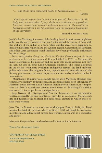 "Once again I repeat that I am not an impartial; objective critic. My judgments are nourished by my ideals, my sentiments, my passions. I have an avowed and resolute ambition: to assist in the creation of Peruvian socialism. I am far removed from the academic techniques of the university."-From the Author's Note Jose Carlos Mariátegui was one of the leading South American social philosophers of the early twentieth century. He identified the future of Peru with the welfare of the Indian at a time when similar ideas were beginning to develop in Middle America and the Andean region. Generations of Peruvian and other Latin American social thinkers have been profoundly influenced by his writings. Seven Interpretive Essays on Peruvian Reality (Siete ensayos de interpretación de la realidad peruana), first published in 1928, is Mariátegui's major statement of his position and has gone into many editions, not only in Peru but also in other Latin American countries. The topics discussed in the essays-economic evolution, the problem of the Indian, the land problem, public education, the religious factor, regionalism and centralism, and the literary process-are in many respects as relevant today as when the book was written. Mariátegui's thinking was strongly tinged with Marxism. Because contemporary sociology, anthropology, and economics have been influenced by Marxism much more in Latin America than in North America, it is important that North Americans become more aware of Mariátegui's position and accord it its proper historical significance. Jorge Basadre, the distinguished Peruvian historian, in an introduction written especially for this translation, provides an account of Mariátegui's life and describes the political and intellectual climate in which these essays were written.