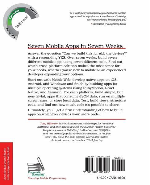 Answer the question "Can we build this for ALL the devices?" with a resounding YES. Learn how to build apps using seven different platforms: Mobile Web, iOS, Android, Windows, RubyMotion, React Native, and Xamarin. Find out which cross-platform solution makes the most sense for your needs, whether you're new to mobile or an experienced developer expanding your options. Start covering all of the mobile world today. Understanding the idioms, patterns, and quirks of the modern mobile platforms gives you the power to choose how you develop. Over seven weeks you'll build seven different mobile apps using seven different tools. You'll start out with Mobile Web; develop native apps on iOS, Android, and Windows; and finish by building apps for multiple operating systems using the native cross-platform solutions RubyMotion, React Native, and Xamarin. For each platform, you'll build simple, but non-trivial, apps that consume JSON data, run on multiple screen sizes, or store local data. You'll see how to test, how to build views, and how to structure code. You'll find out how much code it's possible to share, how much of the underlying platform you still need to know, and ultimately, you'll get a firm understanding of how to build apps on whichever devices your users prefer. This book gives you enough first-hand experience to weigh the trade-offs when building mobile apps. You'll compare writing apps on one platform versus another and understand the benefits and hidden costs of cross-platform tools. You'll get pragmatic, hands-on experience writing apps in a multi-platform world. What You Need: You'll need a computer and some experience programming. When we cover iOS, you'll need a Mac, and when we cover Windows Phone you'll need a computer with Windows on it. It's helpful if you have access to an iPhone, Android phone, and Windows Phone to run the examples on the devices where mobile apps are ultimately deployed, but the simulators or emulator versions of those phones work great.